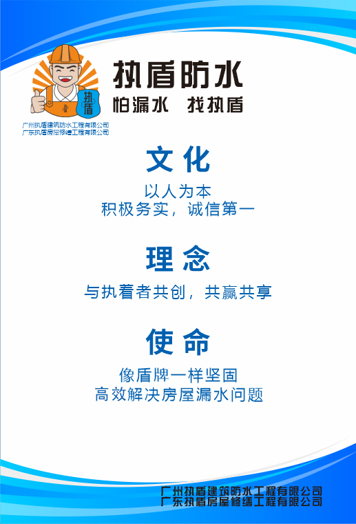 广东执盾房屋修缮工程有限公司是一家专业从事防水堵漏施工的企业,房屋防水补漏、厨房防水,卫生间防水,地下室防水堵漏,户外防水,屋面防水等各种防水补漏工程,公司旗下品牌:执盾防水,聚焦广州和佛山,打造广佛本地专业防水补漏连锁品牌。您只需一个电话预约,我们免费上门查看现场,根据现场情况定制合适的施工方案,施工签订合同,质量保证,完善的售后服务,高效专业解决渗水漏水问题,以免带来后续不必要的麻烦。