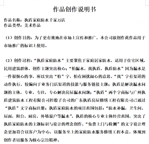 在防水堵漏领域中,广东执盾房屋修缮工程有限公司再创佳绩,其文字作品《执盾家庭防水千家万店》顺利获得了著作权登记。这不仅是对公司多年积累的专业经验和卓越服务的肯定,更是对未来发展的重要保障。我们热烈祝贺这一重要时刻,并为其取得的成绩感到由衷的高兴。